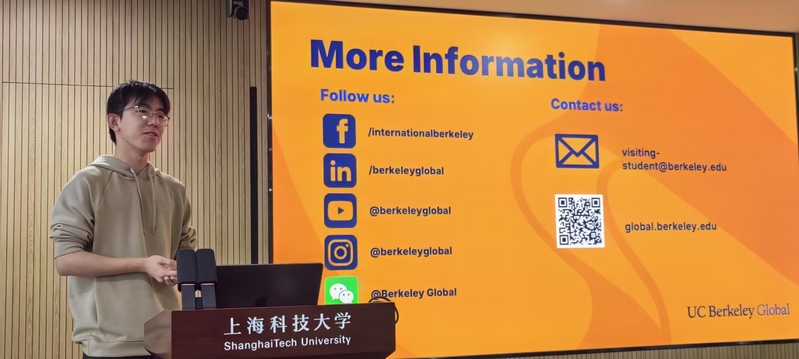 宣讲会特设 “学长分享” 环节,曾参与伯克利交流的上科大学子,数学所关景荣同学,从课程选择、校园活动到生活服务,分享切身体验:伯克利图书馆夜读陪护服务,国际学生服务中心一对一应答学生咨询,丰富的讲座、沙龙和课外活动,让在场同学对交流生活充满期待。提问环节中,同学们关于选课优先级、实习资源对接、生活适应等问题踊跃提问,分享嘉宾逐一细致解答,互动氛围热烈。
